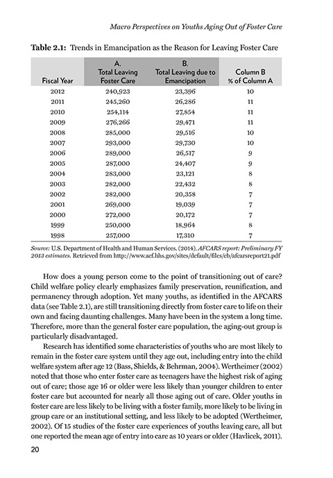 Full title = Macro Perspectives on Youths Aging Out of Foster Care. This design shows a common business book design which includes tables, boxes, glossary, and an index.