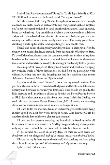This story is an adventure in Richard Bach’s life as he traveled from the east coast to the west coast (USA) with his newly purchased amphibious small airplane. He detailed all the events throughout his trip with a journal and pictures. To give the design a tie to the topic of this book, I setup 6 different chapter openers each with Puff in flight representing the theme of the chapter. I represented Puff on each page using a screened image of the tail behind the page number.